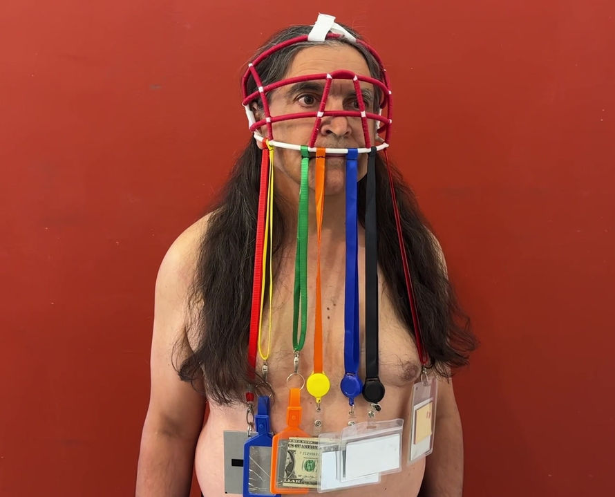 Border Guards was created with the intention of providing symbolic and supernatural protection to immigrants on their journey across borders to create new lives. The catcher’s masks are softened with red embroidery thread, colored ribbon, plastic twine and chrome chain. The color of blood, red is historically associated with sacrifice, danger, courage and, in some cultures, with happiness. Other components further embellish the masks’ appearance and meaning. Mirrors refer to an eternal present moment. They symbolically deflect attention which would be an auspicious benefit for anyone crossing a frontier. US dollar bills hang from ribbon lanyards like identity badges. Silver milagros in gilded frames refer to good fortune and the creation of a bright future. Human hair is symbolic of an afterlife journey and refers to the eternity of labor.